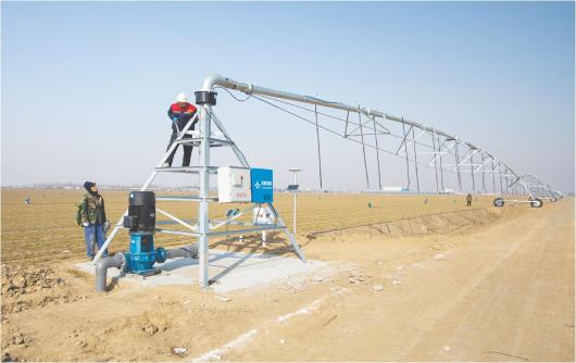 近日,在山东省广饶县李鹊镇一万亩高端优质粮食智能示范区,工作人员正在安装大型自走式节水喷灌设备。