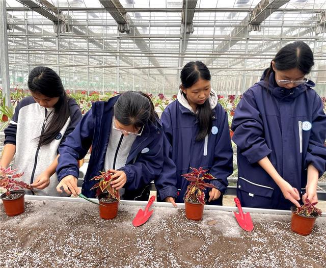 研学首站设在土右旗现代农业博览园,这里为同学们打开了一扇神奇的科技农业之窗。在立体无土栽培展示区,蔬菜与花卉并非生长于土壤,而是在层层叠叠的栽培架上、在精心配比的营养液中茁壮成长,这一景象引得同学们连连惊叹。在叶菜水培区,讲解员深入浅出地讲解了无土栽培、水培与传统土培的差异,同学们踊跃提问。知识的探索不止于聆听,更在于亲手实践。随后的无土栽培操作环节中,同学们在工作人员指导下分组协作,从固定植株到调配营养液,每一步都一丝不苟,让科技农业的种子在心中“落地生根”。
