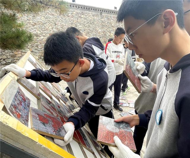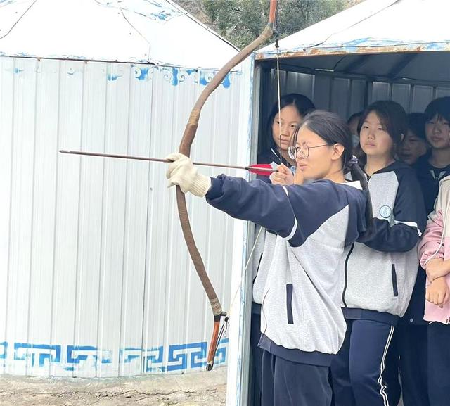 研学期间,同学们来到美岱召旅游景区,体验传统文化的深厚底蕴。壁画拼图区里,各组同学通力协作,仔细辨认、耐心拼接,让一幅幅承载着历史的美岱召壁画重现光彩。传统射箭体验区同样气氛热烈,在专业教练的指导下,同学们穿戴好护具,练习拉弓、瞄准,一次次专注的尝试,让每个人都亲身体验到古代游牧文化的豪迈与激情。初二学生白悠然在成功中靶后兴奋地分享:“中靶的那一刻,成就感满满。这次活动让我对历史有了更真切的认识,非常有意义!”